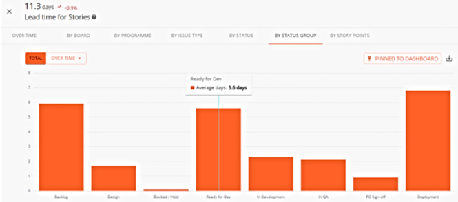 In the example above, the inactive statuses such as ‘Ready for Development’ account for a relatively large proportion of the overall Lead Time (5.6 days), hence there is friction in the process, and there is scope to reduce the overall Lead Time and thereby increase software delivery velocity.