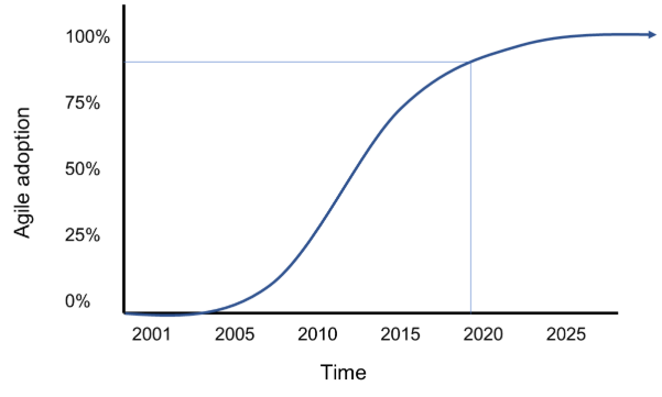As such, Agile finds itself approaching the top of the “S” of the adoption curve (see below). As with all innovations approaching late-adoption maturity, the honeymoon period is over and businesses working in Agile are under increasing pressure to demonstrate that their Agile transformations are successful and adding real business benefits.