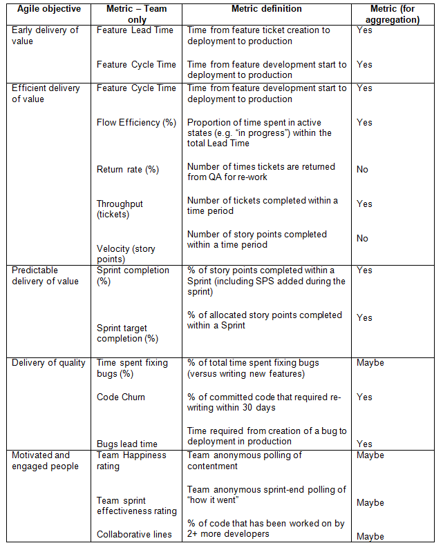 As the table shows, some of the metrics are used by the team only and will not be compared across teams. Some can be aggregated across teams in order to give managers an overall view of progress.