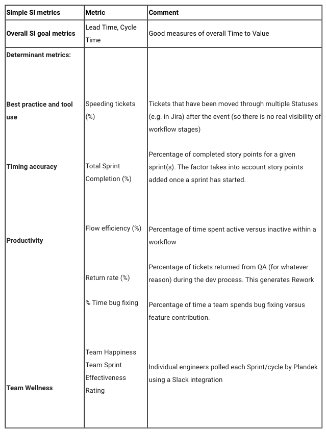 - In addition to focusing on best practice “hygiene” metrics, teams can build their self-improvement initiatives around five further determinant metric sets…