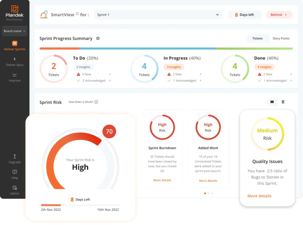 Get Plandek SmartDelivery for real-time insights to deliver sprints & epics faster & more predictably. Powered by AI to help mitigate risks and blockers.